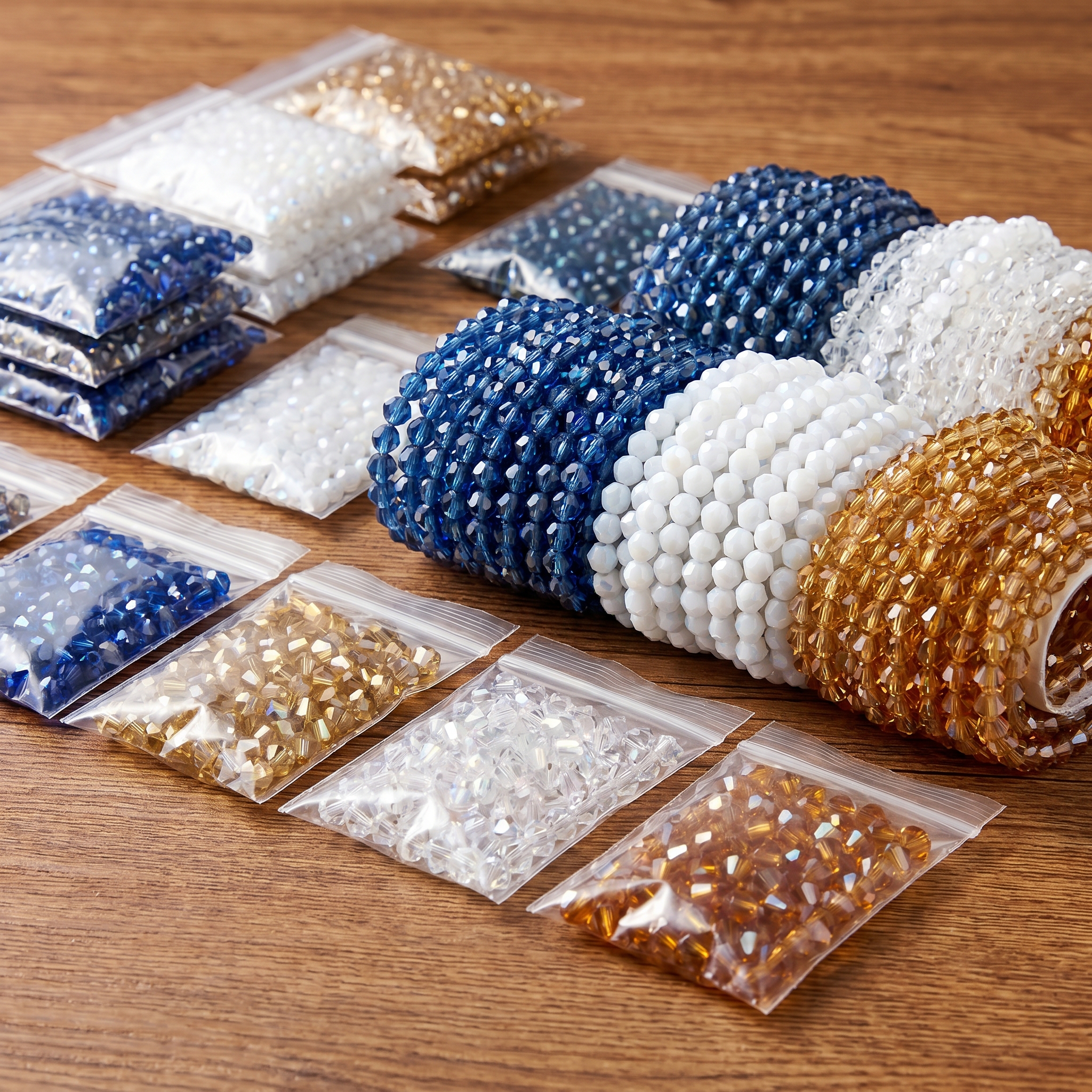 - Korálky sluníčka bicone: Hranatý tvar s reflexí světla, ideální pro moderní designy.